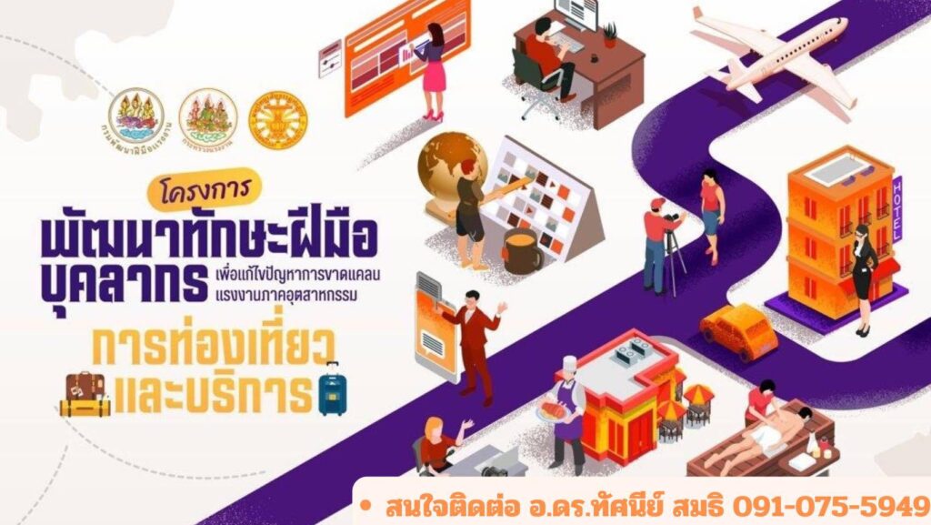 กรมพัฒนาฝีมือแรงงาน ร่วมกับมหาวิทยาลัยธรรมศาสตร์ จัดโครงการพัฒนาทักษะฝีมือบุคลากรภาคอุตสาหกรรมการท่องเที่ยวและบริการ โดยกลุ่มเป้าหมาย 3 กลุ่ม ได้แก่ แรงงานที่ทำงานในธุรกิจที่เกี่ยวกับภาคการท่องเที่ยวและบริการ เช่น กลุ่มพนักงานในโรงแรม ร้านอาหาร กลุ่มนักศึกษาระดับ ปวช. ปวส. ปริญญาตรี และกลุ่มแรงงานอิสระที่เกี่ยวข้องกับภาคการท่องเที่ยวและบริการ เช่น แม่ค้าออนไลน์ ฟรีแลนซ์ แบ่งเป็น 3 หลักสูตร ได้แก่ การฝึกอบรมท่องเที่ยวและบริการหลักสูตร 18 ชั่วโมง (ชม.) จำนวน 3,000 รุ่น 20 คนต่อรุ่น รวม 60,000 คน โดยการฝึกอบบรมแบบออนไลน์ (Online) จำนวน 2 วัน แบบออนไซต์ (Onsite) จำนวน 1 วัน และการฝึกอบรมท่องเที่ยวและบริการหลักสูตร 30 ชม. จำนวน 500 รุ่น 20 คนต่อรุ่น รวม 10,000 คน