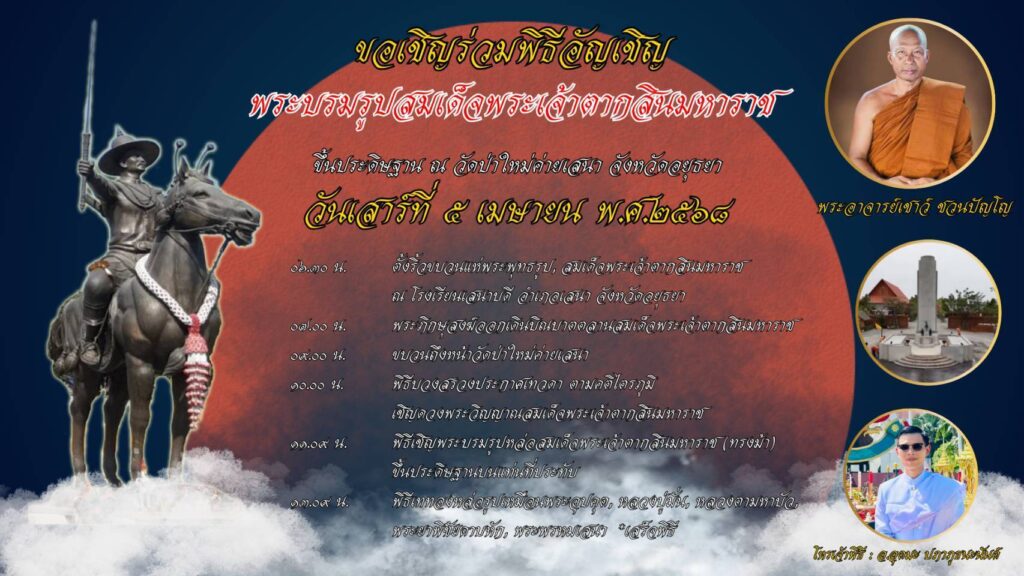 จึงขอเรียนเชิญประชาชนชาวไทยพุทธศาสนิกชนทุกท่าน ได้เข้าร่วมพิธีฯ ณ วัดป่าใหม่ค่ายเสนา อำเภอเสนา จังหวัดอยุธยา