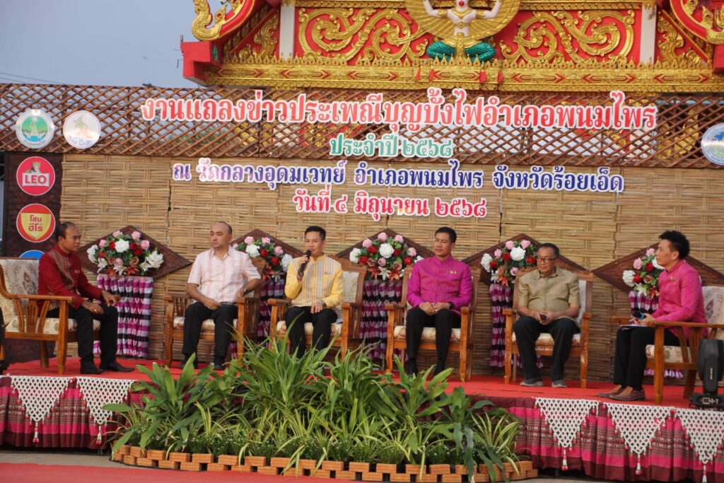 วันนี้ (4 มิถุนายน 2568) เวลา 17.00 น. ณ บริเวณลานหน้าองค์พระมหาธาตุ วัดกลางอุดมเวทย์ อำเภอพนมไพร จังหวัดร้อยเอ็ด นายพิชัยยา ตุระซอง รองผู้ว่าราชการจังหวัดร้อยเอ็ด ประธานการแถลงข่าวการจัดงาน “ประเพณีบุญบั้งไฟอำเภอพนมไพร” ประจำปี 2568 พร้อมด้วย ผู้แทนผู้อำนวยการ ททท.สำนักงานขอนแก่น นายอุดมเกียรติ หงษ์มาลา นายอำเภอพนมไพร นายประเสริฐ วรกาญจนบุญ ประธานสภาวัฒนธรรมอำเภอพนมไพร และนายคำหล้า สีหะบุตร ปลัดเทศบาลตำบลพนมไพร พร้อมชมการแสดงขบวนนางรำต้อนรับ การแสดงขบวนเชิ้งบั้งไฟโบราณของคณะลูกหลานองค์พระมหาธาตุวัดกลางอุดมเวทย์ การแสดงวงโปงลางของโรงเรียนพนมไพรวิทยาคาร โดยมีหัวหน้าส่วนราชการ หน่วยงานที่เกี่ยวข้อง ตลอดจนประชาชนชาวอำเภอพนมไพร นักท่องเที่ยวและสื่อมวลชน เดินทางมาร่วมงานแถลงข่าวอย่างคับคั่ง