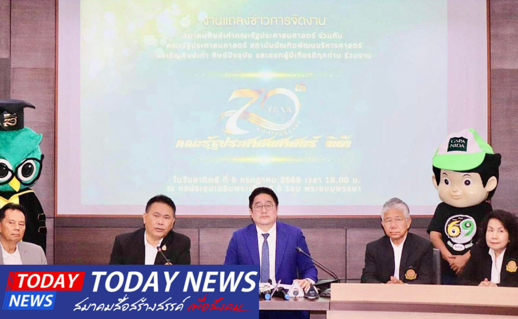 รศ.ดร.อัชกรณ์ วงศ์ปรีดี คณบดีคณะรัฐประศาสนศาสตร์ สถาบัน บัณฑิตพัฒนบริหารศาสตร์ พล.ต.ต.ดร.ชยุต มารยาทตร์ นายกสมาคมศิษย์เก่าคณะรัฐประศาสนศาสตร์ พร้อมด้วยคณะกรรมการบริหารสมาคม ได้ร่วมกันแถลงข่าวการจัดงาน “70 ปี คณะรัฐประศาสนศาสตร์ นิด้า” และ “23 ปี สมาคม ศิษย์เก่าคณะรัฐประศาสนศาสตร์ นิด้า” ประจำปี 2568 ซึ่งกำหนดการจัดงานในวันอาทิตย์ที่ 6 กรกฎาคม 2568 ระหว่างเวลา 18.00-23.30 น. ณ ห้องประชุมเฉลิมพระเกียรติ 6 รอบ พระชนมพรรษา สถาบันบัณฑิตพัฒนบริหารศาสตร์ (NIDA) ซึ่งในการจัดงานดังกล่าว มีวัตถุประสงค์เพื่อให้ศิษย์เก่าคณะรัฐประศาสนศาสตร์ ได้กลับมาเยี่ยมและเห็นความเจริญก้าวหน้าของสถาบัน ได้มีโอกาสมาร่วมพิธีแสดงมุทิตาจิตต่อคณาจารย์ที่เคยอบรมสั่งสอนกันมา ตลอดจนได้มาพบปะพูดคุยและแลกเปลี่ยนประสบการณ์กันระหว่างเพื่อน ศิษย์รุ่นพี่ ศิษย์รุ่นน้องและศิษย์ปัจจุบัน เพื่อเชื่อมความสัมพันธ์ของเครือข่ายศิษย์เก่าให้เข้มแข็งและยั่งยืน