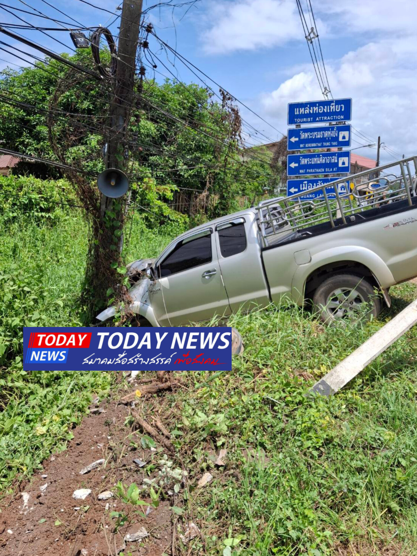 รถกระบะเสียหลักชนเสาไฟฟ้า โชคดีบาดเจ็บเล็กน้อย คาดคนขับวูบขณะขับขี่