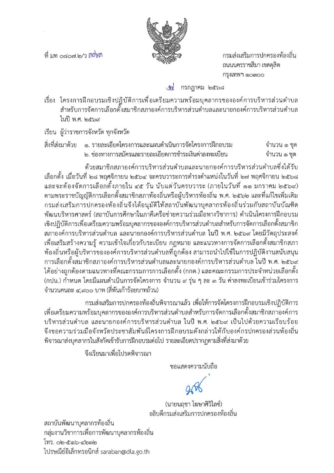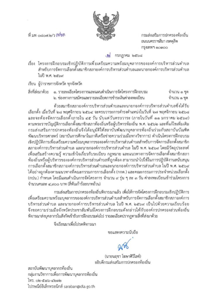 เรื่องโครงการฝึกอบรม เชิงปฏิบัติการ เพื่อเตรียมความพร้อมของบุคลากร ขององค์กร บริหารส่วนตำบล พี่มีส่วนเกี่ยวข้องกับการ จัดการเลือกตั้ง สมาชิก องค์การบริหารส่วนตำบล และนายก องค์การบริหารส่วนตำบล ทั่วประเทศ ในปี 2569 ดูให้หน่วยงานองค์กรปกครอง บริหารส่วนตำบลพิจารณา ส่งบุคลากรเข้าร่วมการฝึกอบรม เพื่อให้การ จัดการเลือกตั้ง เป็นไปอย่าง มีประสิทธิภาพ และถูกต้อง