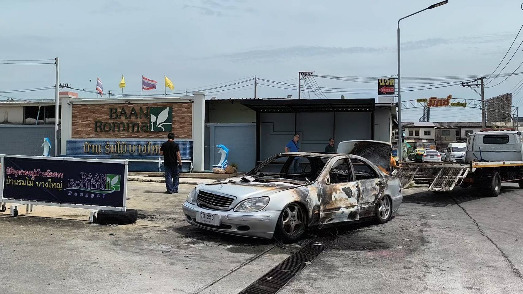 ที่เกิดเหตุบริเวณทางเข้าหมู่บ้านดังกล่าว พบรถยนต์เก๋งหรู ยี่ห้อเมอร์เซเดส-เบนซ์ สีบรอนซ์ หมายเลขทะเบียน วฮ 256 กทม. ถูกเพลิงลุกไหม้บริเวณห้องโดยสาร เสียหายเกือบทั้งคัน เบื้องต้นไม่มีผู้บาดเจ็บ ใช้เวลาประมาณ 30 นาที สามารถควบคุมเพลิงไว้ได้ทั้งหมด