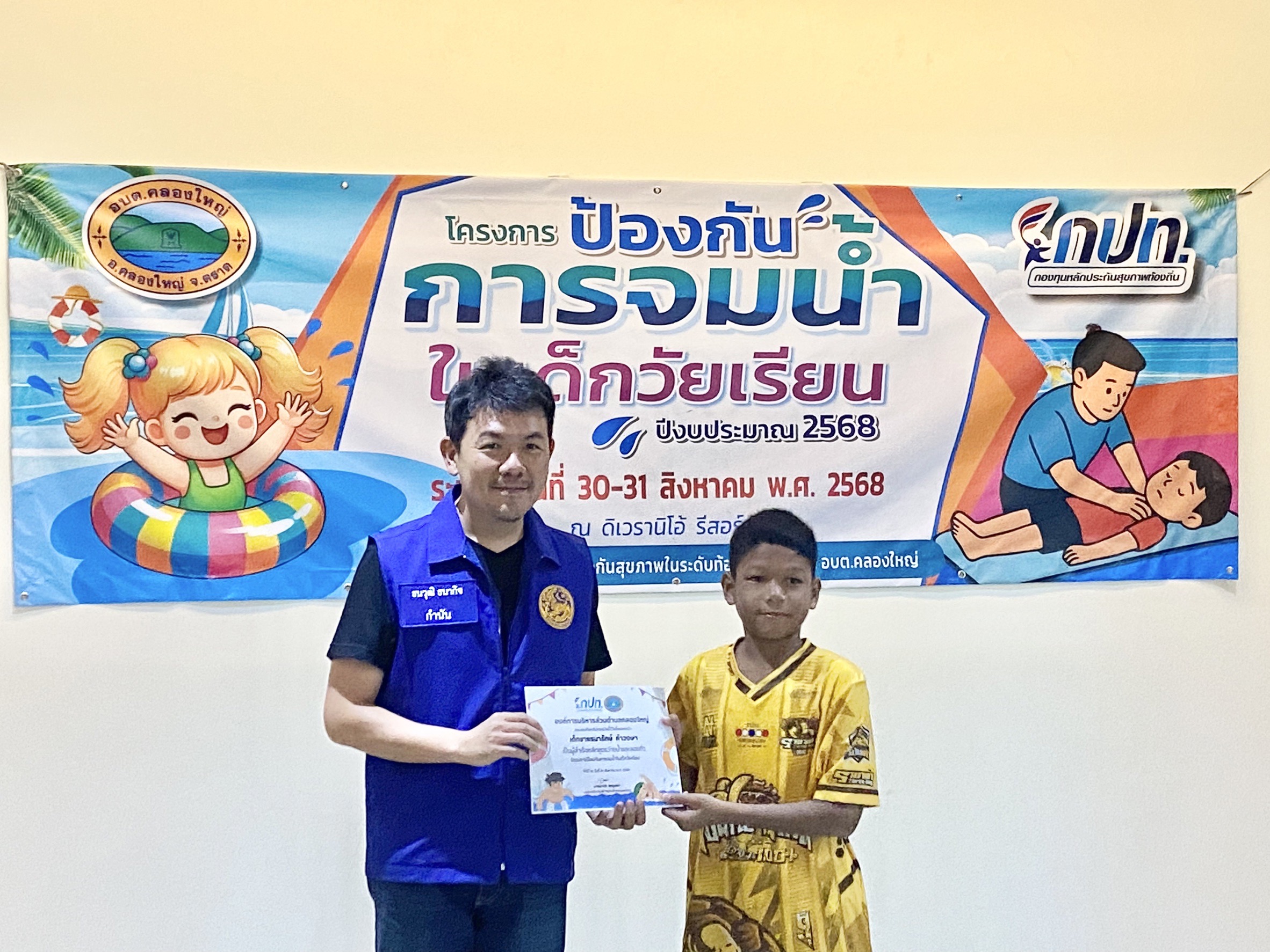 ตราด อบต.คลองใหญ่ จัดอบรมโครงการป้องกันการจมนํ้าในเด็กวัยเรียน ครั้งที่ ๑/๒๕๖๘ ปีงบประมาณ 2568 เมื่อช่วงบ่ายที่ผ่านมา วันที่ 31 สิงหาคม 2568 ณ.ดิเวรานิโอ้รีสอร์ท ต.ไม้รูด อ.คลองใหญ่ จ.ตราด นายธนวุฒิ ธนากิจ กํานันตําบลคลองใหญ่ ให้เกียรติเข้าร่วม เป็นประธานในพิธีปิดการอบรมจัดโครงการป้องกันการจมนํ้าในเด็กวัยเรียน ครั้งที่ ๑/๒๕๖๘ ปีงบประมาณ 2568 โดยให้การสนับสนุนกองทุนหลักประกันสุขภาพในระดับท้องถิ่นในพื้นที่ของ อบต.คลองใหญ่ โดยมีนายนพพร หารเหี้ยม สํานักงานสาธารณสุขอําเภอคลองใหญ่ กล่าวรายงาน นายนพพร ลองศิริคง เจ้าหน้าที่ป้องกันและบรรเทาสาธารณภัย ทีมวิทยากร อบต.คลองใหญ่ พร้อมผู้เข้าร่วม คณะผู้บริหาร สมาชิก อบต.คลองใหญ่ สาธารณสุข อําเภอคลองใหญ่ กํานัน และคณะครูอาจารย์ นักเรียนในพื้นที่ทั้ง 3 โรงเรียน เข้าร่วมอบรมโครงการป้องกันการจมนํ้าในเด็กวัยเรียน จํานวน 45 คน จบลงแล้ว พร้อมจบหลักสูตร จํานวน 2 วัน และ