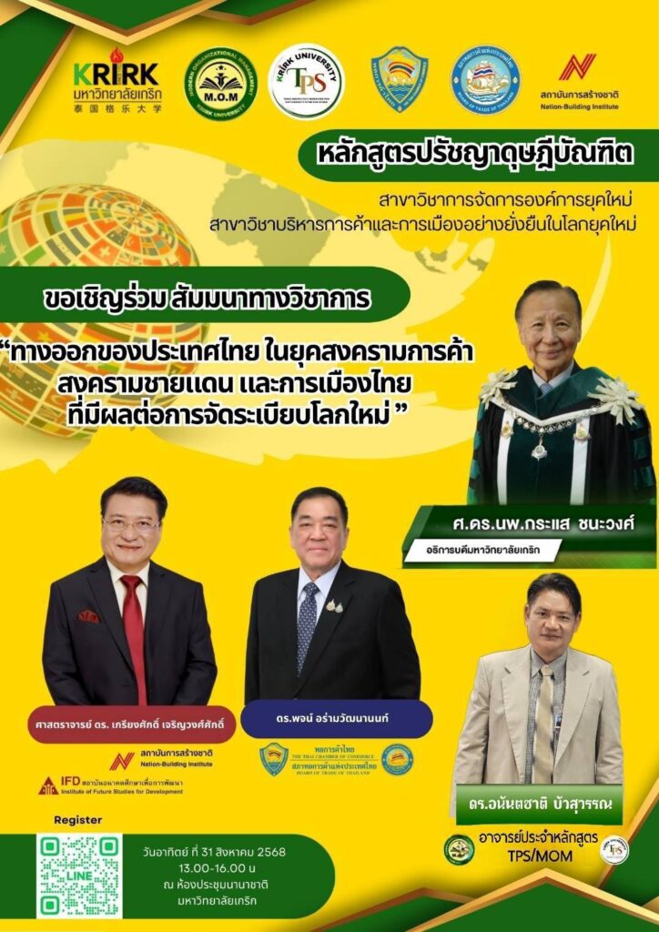 ประชาสัมพันธ์ Published 5 เดือน ago on กันยายน 1, 2025 By admin3 admin3 การสัมมนาวิชาการและปฐมนิเทศนักศึกษาปริญญาเอก มหาวิทยาลัยเกริกวันที่ 31 สิงหาคม 2568 หลักสูตรปรัชญาดุษฎี สาขาวิชาการจัดการองค์การยุคใหม่ รุ่นที่4 (Ph.D.M.O.M) สาขาวิชาการบริหารการค้าและการเมืองอย่างยั่งยืนในโลกยุคใหม่ รุ่นที่1 (Ph.D.TPS) ได้จัดการสัมมนาวิชาในหัวข้อ“ทางออกประเทศไทยในยุคสงครามการค้า สงครามชายแดน และการเมืองไทย ที่มีผลต่อการจัดระเบียบโลกใหม่” พร้อมทั้งการปฐมนิเทศนักศึกษาใหม่ ในระดับปริญญาเอก โดย ประธานกรรมการบริหารและผู้อำนวยการหลักสูตร ผู้ช่วยศาสตราจารย์ ดร.ธนชาติ ประทุมสวัสดิ์ พร้อมด้วยวิทยากรผู้ทรงคุณวุฒิ ศาสตราจารย์ ดร.เกรียงศักดิ์ เจริญวงศ์ศักดิ์ ประธานสถาบันอนาคตศึกษาเพื่อการพัฒนาและสถาบันการสร้างชาติ, ดร.พจน์ อร่ามวัฒนานนท์ ประธานกรรมการหอการค้าไทยและสภาหอการค้าแห่งประเทศไทย นอกจากนั้นยังมี อาจารย์ดร.อนันตชาติ บัวสุวรรณ ผู้บริหาร ผู้ทรงคุณวุฒิ ของมหาวิทยาลัย และคณะนักศึกษา ป.เอก ทั้งนี้เพื่อให้แนวทางในการศึกษาเพื่อการเป็นดุษฎีบัณฑิตตามความคาดหวังของโลกยุคใหม่ พร้อมทั้งร่วมกันสัมมนาวิชาการในประเด็นที่เป็นวิกฤติ เพื่อหาทางออกให้กับประเทศชาติ เพื่อการสะท้อนแนวคิด มุมมองทางวิชาการในการแก้ปัญหาให้กับชาติ บ้านเมือง ต่อไปดร.อนันตชาติ บัวสุวรรณอาจารย์ประจำหลักสูตร มหาวิทยลัยเกริก Related Topics: Up Next Don't Miss Continue Reading You may like Click to comment Leave a Reply ยกเลิกการตอบอีเมลของคุณจะไม่แสดงให้คนอื่นเห็น ช่องข้อมูลจำเป็นถูกทำเครื่องหมาย *ความเห็น * ชื่อ * อีเมล * เว็บไซต์ บันทึกชื่อ, อีเมล และชื่อเว็บไซต์ของฉันบนเบราว์เซอร์นี้ สำหรับการแสดงความเห็นครั้งถัดไป Δ