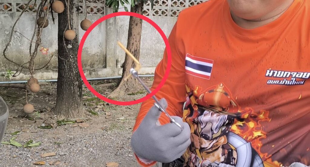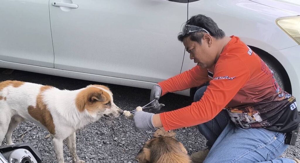 เมื่อเวลา 11.25 น.ของวันที่ 1 กันยายน 2568 ที่ลานจอดรถวัดหลวงพ่อปากแดง ตำบลบ้านใหญ่ อำเภอเมือง จังหวัดนครนายก ศูนย์วิทยุกู้ภัยองค์การบริหารส่วนตำบลบ้านใหญ่ ได้รับแจ้งเหตุจากคุณศิรินภา ศรียา แม่ค้าขายกาแฟภายในบริเวณลานจอดรถ ว่าพบสุนัขเดินมาแล้วเอาขาเขี่ยไปที่ปากร้องขอความช่วยเหลือ จึงได้โทรแจ้งศูนย์กู้ภัยองค์การบริหารส่วนตำบลบ้านใหญ่ให้มาช่วยเหลือ เมื่อศูนย์วิทยุได้รับแจ้งจึงประสานนายอำนาจ สว่างอารมย์ เจ้าหน้าที่กู้ภัยฯลูกข่ายเดินทางไปที่ลานจอดรถวัดหลวงพ่อปากแดง พบสุนัขเพศผู้สีขาวคาดน้ำตาล ชื่อเจ้าปีใหม่ เป็นหมาจรมีไม้ลูกขิ้นเข้าไปติดในปากเพดานด้านบน เจ้าหน้าที่กู้ภัยจึงได้ปิดทางล้อมให้เข้าไปอยู่ใต้โต๊ะแม่ค้าขายผักแล้วเอาอาหารให้กิน เพื่อว่าไม้ที่ติดคาปากจะหลุดออกมาได้เอง แต่ไม้ที่หักคาปากอยู่ไม่ยอมหลุดออก เจ้าหน้าที่กู้ภัยฯจึงได้นำลูกชิ้นที่เสียบไม้ไว้นำมาล่อให้เจ้าปีใหม่ได้อ้าปากขึ้นแล้วใช้อุปกรณ์ตัวคีบที่เตรียมมาคีบไม้ลูกชิ้นออกมาได้สำเร็จ