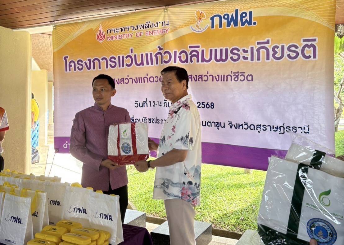 นายกสมาคมชาวสุราษฎร์ รวมกับกระทรวงพลังงาน และการไฟฟ้าฝ่ายผลิตแห่งประเทศไทย(กฟผ.) ร่วมกิจกรรมการแจกแว่นตาให้กับประชาชนในโครงการ “แว่นแก้วเฉลิมพระเกียรติฯ”