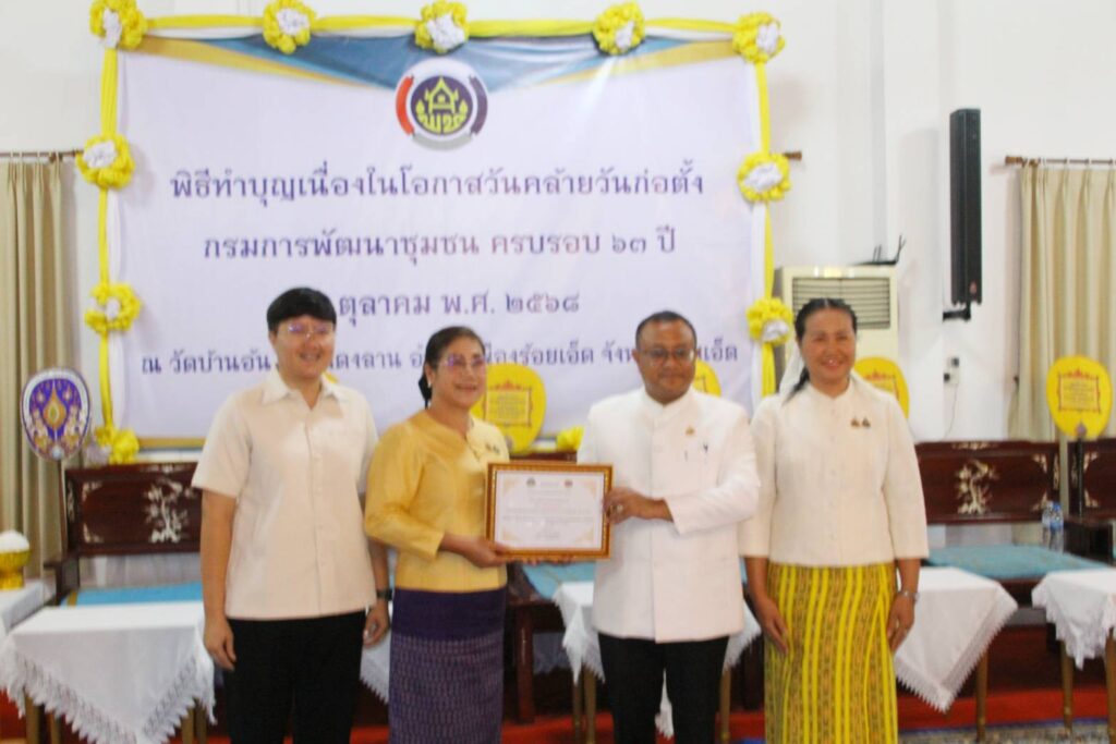 เมื่อวันที่ 3 ตุลาคม 2568 เวลา 10.30 น. ณ วัดบ้านอ้น (สุวรรณาราม) ตำบลดงลาน อำเภอเมืองร้อยเอ็ด จังหวัดร้อยเอ็ด สำนักงานพัฒนาชุมชนจังหวัดร้อยเอ็ด จัดงานเนื่องในโอกาสวันคล้ายวันก่อตั้งกรมการพัฒนาชุมชน ครบรอบ 63 ปี