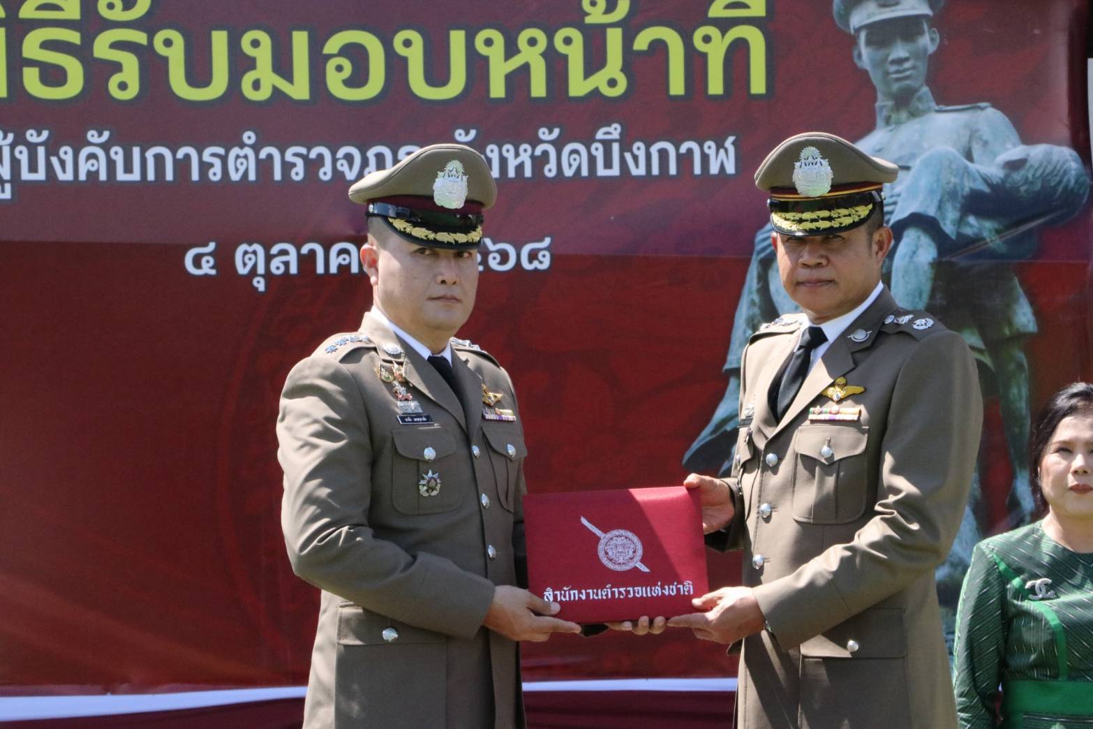 โดยในเวลา​ 10.30​ น.​ พล.ต.ต.ดร.ศิรสัณห์​ เยื้อนสงวนชัย​ ผู้บังคับการตำรวจภูธรจังหวัดบึงกาฬ​ รับความเคารพ​ และตรวจแถวกองเกียรติยศ จากนั้นทำพิธีส่งมอบธงประจำหน่วย​ โดย​มี พ.ต.อ.​อารักษ์​ มะสาธานัง​ รองผู้บังคับการตำรวจภูธรจังหวัดบึงกาฬ​ ส่งมอบธงประจำหน่วย​ และส่งมอบหน้าที่​ ต่อผู้บังคับการตำรวจภูธรจังหวัดบึงกาฬ​
