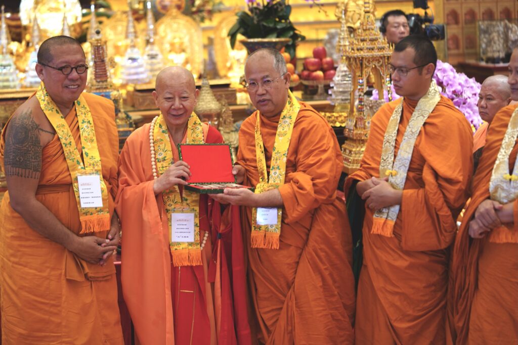โดยในพิธีซึ่งกำหนดตั้งแต่ช่วงเช้าตรู่ของวันที่ 5 ตุลาคม 68 คณะสงฆ์จากนานาชาติ ได้เคลื่อนอัญเชิญพระบรมสารีริกธาตุและพุทธมงคลวัตถุ เข้าสู่ห้องโถงพิธีการจากนั้นได้ร่วมกันเจริญพระพุทธมนต์เพื่อน้อมถวายสักการะและขอพรอันเป็นมงคลให้แก่ผู้เข้าร่วมพิธีซึ่งประกอบด้วยพุทธศาสนิกชนจากประเทศไต้หวัน ประเทศไทย ประเทศมาเลเซีย ประเทศเมียนมาร์ และอีกหลายชาติ ซึ่งพร้อมใจกันเข้าร่วมพิธีดังกล่าว