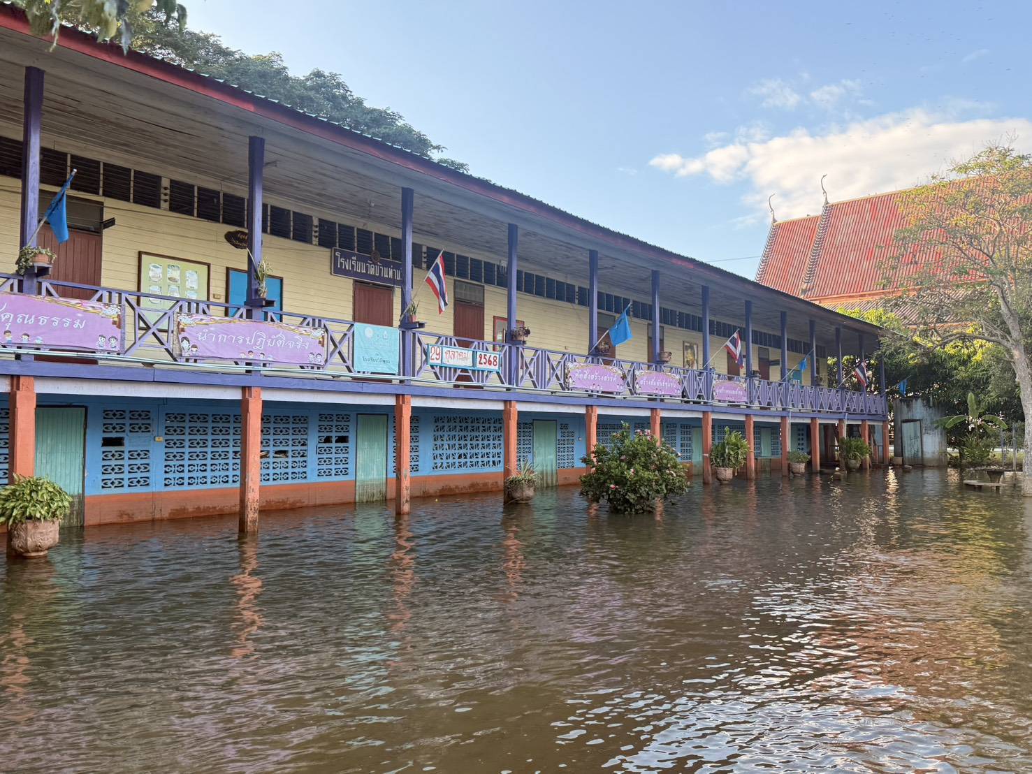 จุดที่ 3 โรงเรียนวัดบ้านบางลายใต้ อำเภอบึงนาราง น้ำท่วมขังมา 1 เดือนกว่า น้ำล้นจากตลิ่ง ม.ยม ท่วมขังในสนามเป็นพื้นที่กว้างและส่งกลิ่นเหม็น ทาง อบต.บางลาย ได้ประสาน นายอำเภอ กำนัน ผู้ใหญ่บ้านในพื้นที่ จัดหาเครื่องสูบน้ำจำนวน 5-6 เครื่อง เร่งระบายน้ำท่วมขังออกจากพื้นที่โรงเรียน ซึ่งจะเสร็จเรียบร้อยก่อนเปิดเรียนวันที่ 3 พฤศจิกายน 2568