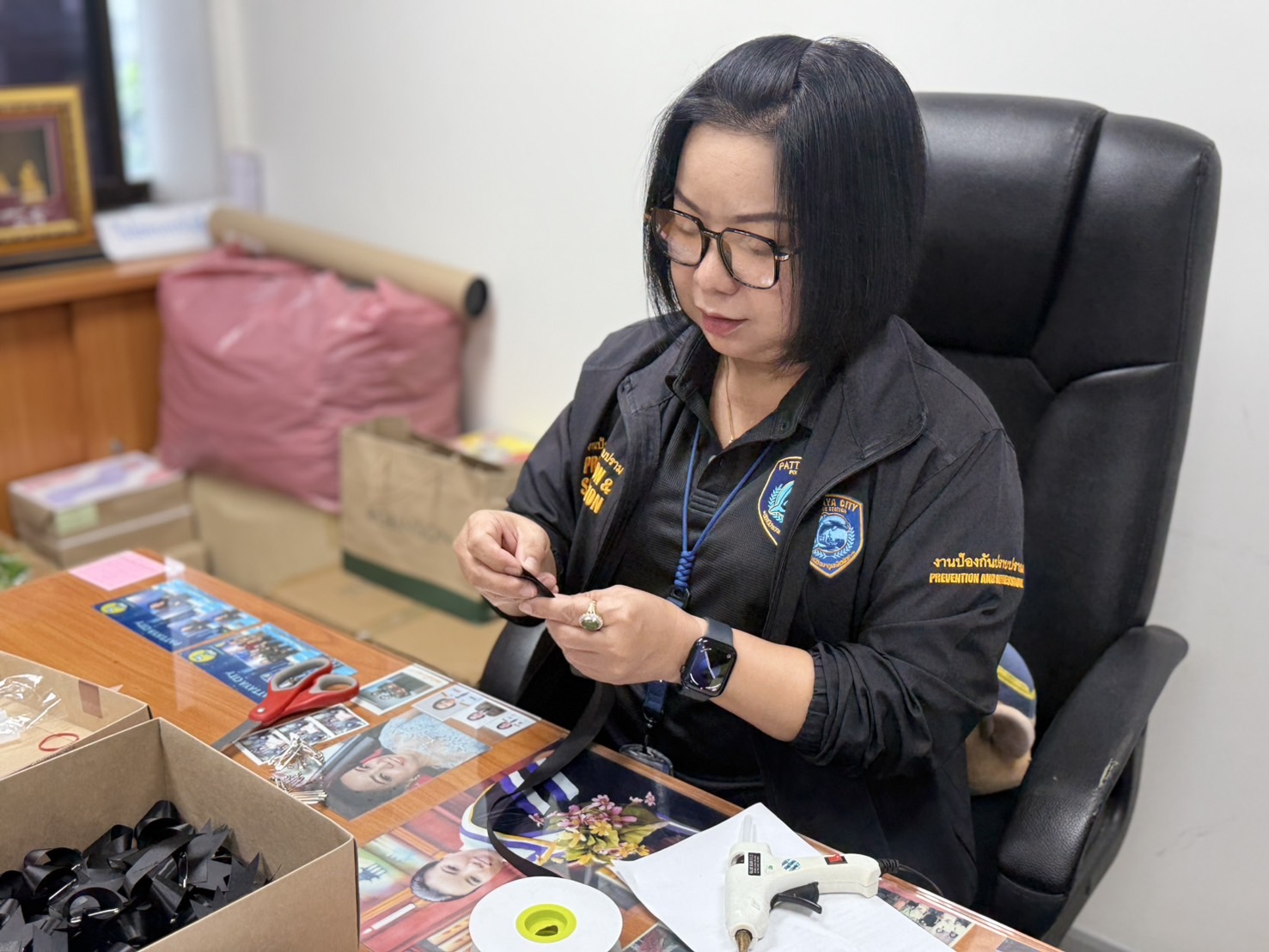 เลขาสาวโรงพักพัทยาอาลัยแม่ฟ้าหลวง จัดทำริบบิ้นดำแจกตำรวจ-ประชาชน