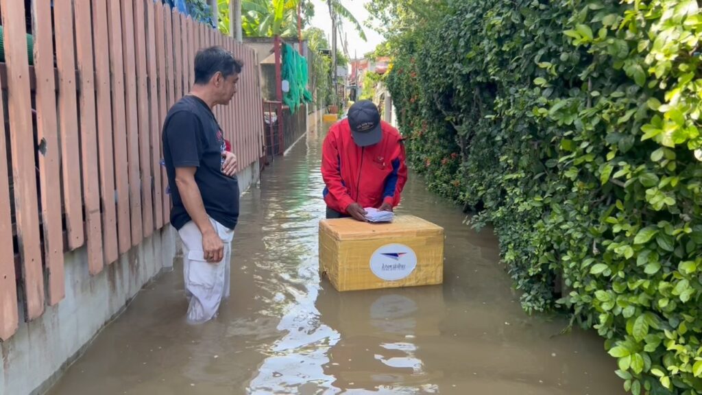 เมื่อวันที่ 16 พ.ย. 68 ผู้สื่อข่าวลงพื้นที่บริเวณตำบลเกาะเกร็ด อ.ปากเกร็ด จ.นนทบุรี พบนายสนอง พัทคำ อายุ 59 ปี บุรุษไปรษณีย์ ป่วยเป็นโรคกระดูกทับเส้น เดินลุยกระแสน้ำส่งจดหมาย พัสดุ ให้กับชาวบ้านมานานกว่า 28 ปี ไม่หวั่นแม่เจอน้ำท่วมสูง เดินฝ่ากระแสน้ำเชี่ยว กว่า 6 กิโลเมตร และส่งพัสดุกว่า 1,000 หลังคาเรือน ต่อวันถึงแม้โทรศัพท์จะจมน้ำหายไป 3 เครื่อง ก็ยังคงสู้ต่อส่งของให้ชาวเกาะเกร็ดถึงมือทุกครั้งของที่ส่งไม่เคยได้รับความเสียหายถึงแม้จะใกล้วัยเกษียณอีกแค่ 2 ปีข้างหน้าก็จะขอทำหน้าที่บุรุษไปรณีย์ให้ดีที่สุด