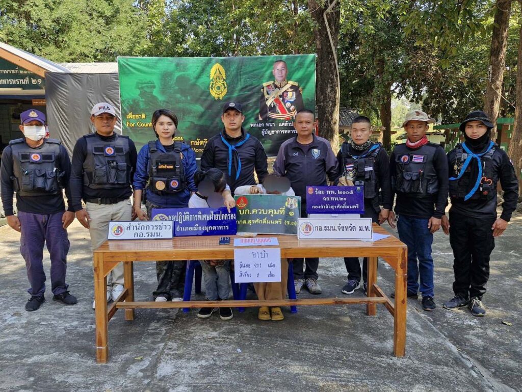 เจ้าหน้าที่ชุดปฏิบัติการร่วมฯ จึงทำการควบคุมตัวทั้งสองคน พร้อมของกลางมายัง บก.ร้อย.ฉก.ทพ.2105 ฉก.ทพ.21 เพื่อดำเนินการสอบสวนขยายผลเพิ่มเติม จากนั้นได้นำตัวผู้ต้องหาทั้ง 2 คน ส่งพนักงานสอบสวน สภ.เมืองมุกดาหาร เพื่อดำเนินคดีตามกฎหมายต่อไป…