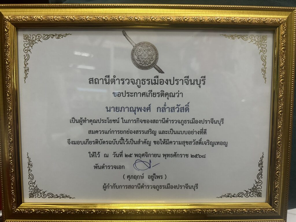 วันที่ 25 พฤศจิกายน 2568 นายภาณุพงศ์ กล่ำสวัสดิ์ หรือ “สจ.แมน” สมาชิกสภาองค์การบริหารส่วนจังหวัดปราจีนบุรี เขต 5 อำเภอเมือง ได้รับเกียรติจากสถานีตำรวจภูธรเมืองปราจีนบุรี มอบโล่ประกาศเกียรติคุณและเกียรติบัตร เพื่อเชิดชูการสนับสนุนสร้างห้องสืบสวนขึ้นใหม่ พร้อมมอบอุปกรณ์ทำงานต่างๆ หลังเหตุเพลิงไหม้ที่ผ่านมา