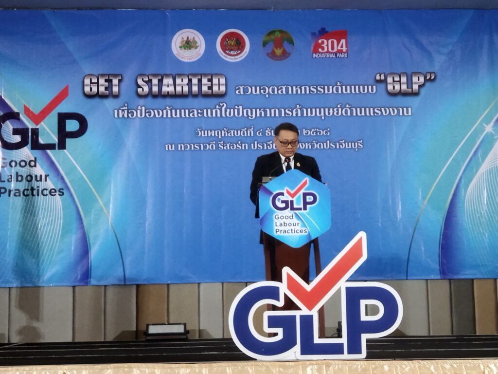 วันที่ 4 ธ.ค. 68 ณ ทวาราวดี รีสอร์ท ต. ท่าตูม อ.ศรีมหาโพธิ จ.ปราจีนบุรี เรือเอก สาโรจน์ คมคาย (อธิบดีกรมสวัสดิการและคุ้มครองแรงงาน ได้รับมอบหมายจาก ท่านตรีนุช เทียนทอง รัฐมนตรีว่าการกระทรวงแรงงาน ให้เป็นประธานในพิธีเปิดงาน GET STARTED สวนอุตสาหกรรมต้นแบบ “GLP” เพื่อป้องกันและแก้ไขปัญหาการค้ามนุษย์ด้านแรงงาน โดยมีนายสัญญา นามี