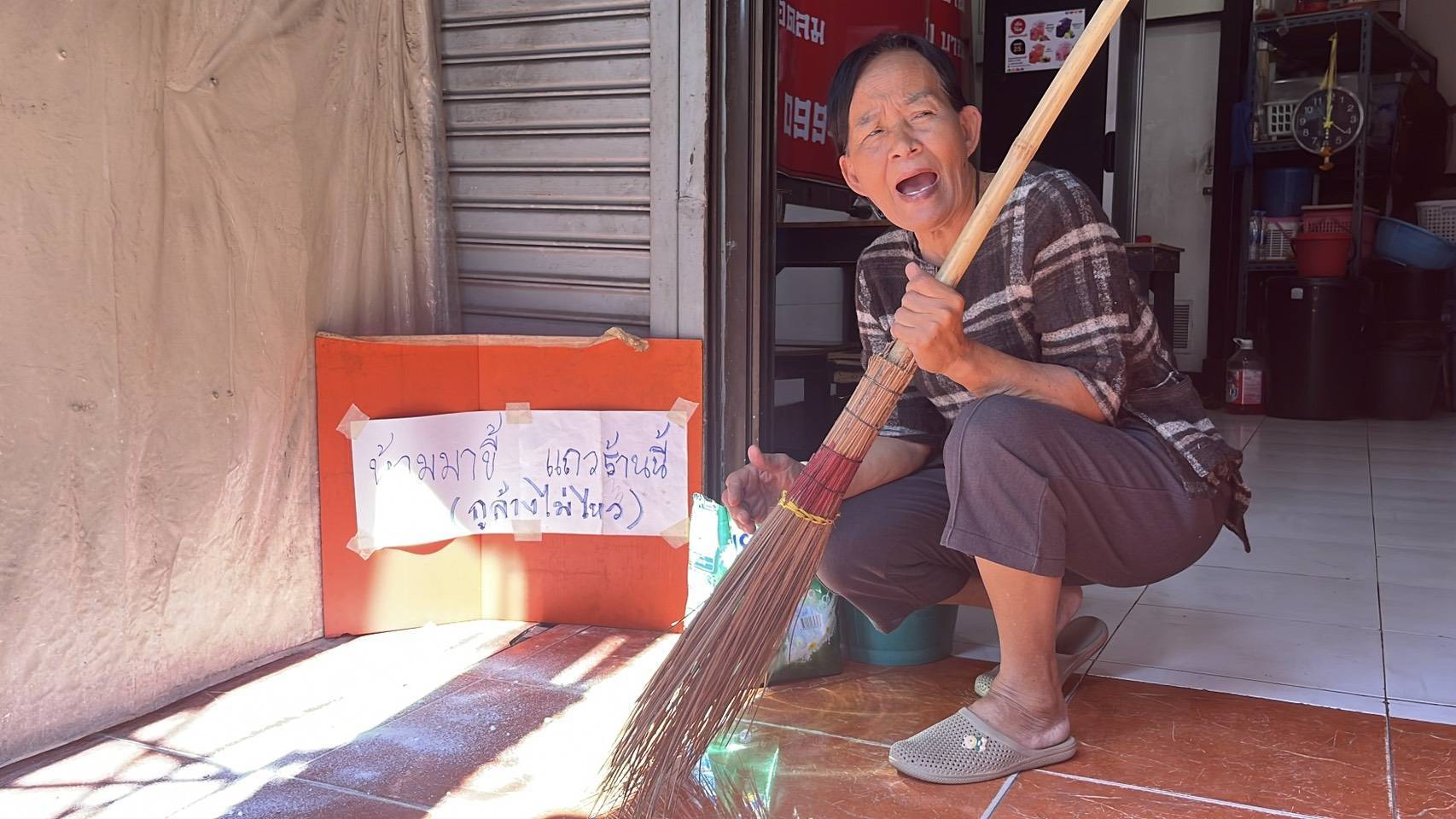 พบนางจันทนา ปาลา หรือยายแหม่ม อายุ 69 ปี กำลังล้างกองขี้ที่สองผัวเมียขี้ทิ้งไว้ให้ดูต่างหน้า โดยนำแฟ้บ-น้ำยาฆ่าเชื้อมาล้างทำความสะอาด ยายแหม่ม เล่าว่า เมื่อวานหลังจากตอนปิดร้านในช่วงเย็น และกลับไปพักผ่อนที่บ้านพักภายในเกาะเกร็ด ลูกสาวก็โทรมาบอกว่า ทางร้านติดๆกันที่ขายอาหารตามสั่งส่งรูปมาให้ดูว่ามีขี้หลายกอง อยู่ที่หน้าร้านตนเอง น่าจะไม่ใช่ขี้หมาเพราะมันกองใหญ่มาก สงสัยว่าจะเป็นขี้คน ตนจึงรีบมาดู ก็พบว่า เป็นขี้ของคนที่ถ่ายทิ้งไว้จริงๆ ตนจึงได้รีบใส่ถุงมือนำแฟ้บ-น้ำยาฆ่าเชื้อมาล้างทำความสะอาด สอบถามชาวบ้านใกล้เคียง มี 2 ผัวเมียมาแอบมานอนอยู่ที่หน้าร้านตน ซึ่งปกติเขาจะแอบนอนอยู่ที่ข้างๆร้านสะดวกซื้อ ตรงข้ามกับร้านตน แต่ทางพนักงานไล่ให้ไปนอนที่อื่น สองผัวเมียจึงมาอาศัยหน้าร้านตนเป็นที่หลับนอน ตนเคยเจอเขาครั้งหนึ่งและต่อว่า เขาก็ส่งมือบุ้ยบ้ายพูดไม่ได้ทั้งคู่ ลักษณะเหมือนคนเป็นใบ้และก็ยกมือไหว้ตน จากนั้นก็ยังทำในลักษณะนี้อีกถึง 7 ครั้งที่ ตนต้องมานั่งคอยเก็บกวาดเก็บขี้ให้เขา จนทนไม่ไหวและรู้สึกโกรธ จึงเขียนป้ายขึ้นมาติดไว้ตรงจุดนี้ที่เขา ขี้ประจำ อยากขอให้เจ้าหน้าที่ที่เกี่ยวข้องมาเอาตัวเขาไปทีถ้าหากเขาไม่มีที่นอนก็เอาไปอยู่ในสถานที่คนไร้ที่พึ่งก็ได้ ยายแหม่มกล่าวพร้อมยกมือขึ้นไหว้ท่วมหัวว่า “ยายขอร้องละ อย่ามาขี้หน้าร้านยายเลย”