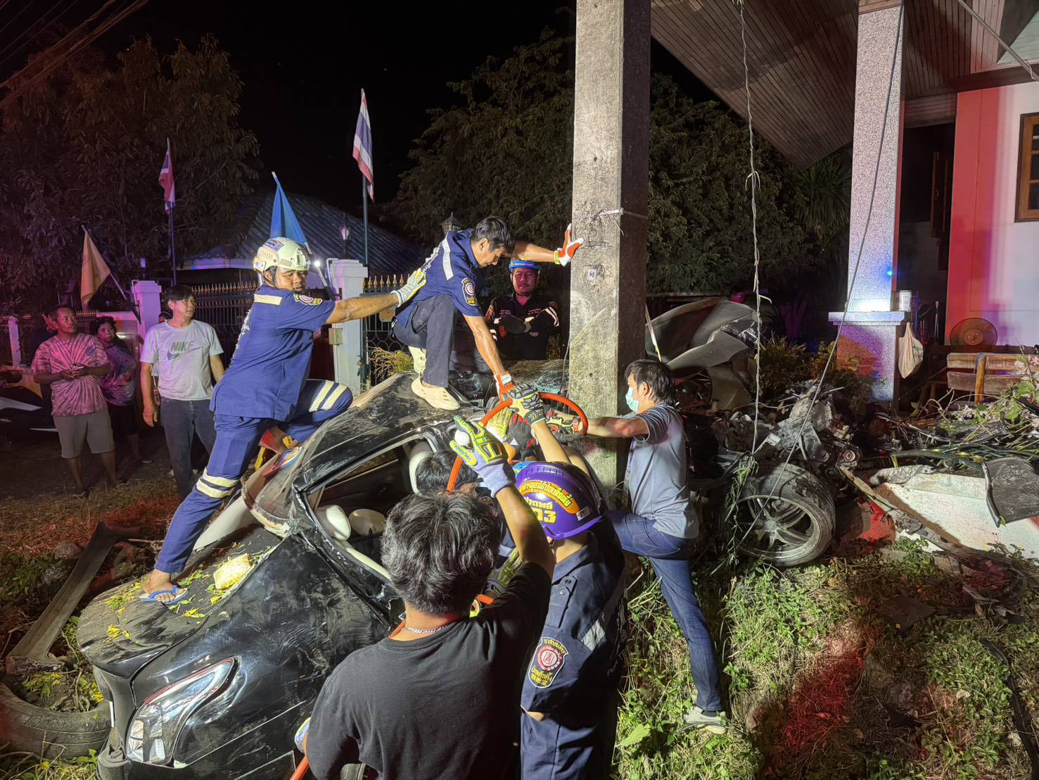 นครนายก เก๋งเสียหลักหลุดโค้งชนเสาไฟเครื่องยนต์กระเด็นคนขับเสียชีวิตคาที่ในซากรถ