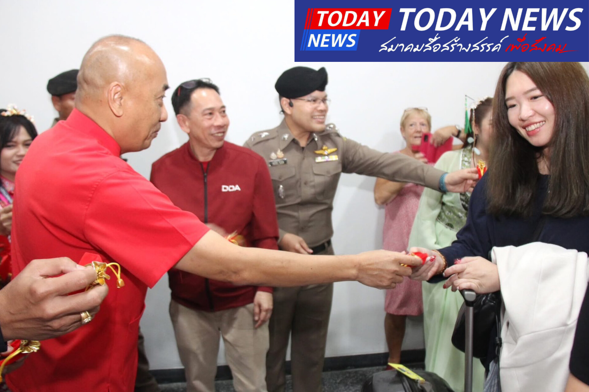 เย็นวันนี้(29 ม.ค.68) ณ ห้องโถงชั้น 1 อาคารที่พักผู้โดยสารท่าอากาศยานสุราษฎร์ธานี นายธีรุตม์ ศุภวิบูลย์ผล ผู้ว่าราชการจังหวัดสุราษฎร์ธานี มอบหมายให้ว่าที่ร้อยโท สมชาย เรืองจันทร์ ปลัดจังหวัดสุราษฎร์ธานี พร้อมด้วยผู้เกี่ยวข้อง ร่วมให้การต้อนรับพร้อมมอบสิ่งของที่ระลึกแก่นักท่องเที่ยวชาวจีน ที่เดินทางมาจังหวัดสุราษฎร์ธานี โดยเที่ยวบินเช่าเหมาลำของสายการบินไลอ้อนแอร์ เส้นทางไทเป – สุราษฎร์ธานี รวมกว่า 180 ชีวิต เพื่อเดินทางมาพักผ่อนท่องเที่ยวในพื้นที่จังหวัดสุราษฎร์ธานี ซึ่งตรงกับช่วงเทศกาลวันตรุษจีน (Chiness New Year)