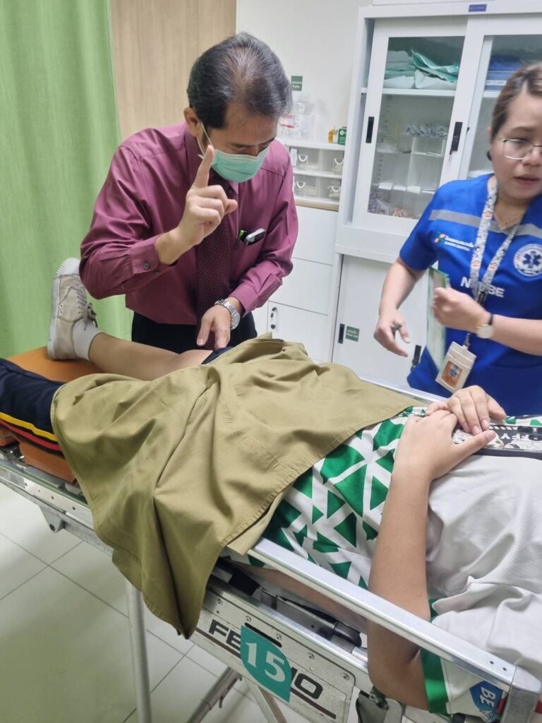 นายจตุพร ผู้เสียหาย เปิดเผยว่า วันเกิดเหตุเวลาประมาณ 07.45 น. ตนได้ขับรถจยย.มาส่งลูกสาวตามปกติ ขณะที่อยู่บริเวณโค้งหน้าวัดเขมาภิรตาราม ปรากฏว่ามีชายขับขี่จยย.ซึ่งมีลูกค้าเป็นนักเรียนซ้อนท้ายมาด้วย เฉี่ยวชนบริเวณด้านข้างขวารถของตน ทำให้เสียหลักล้มลง พร้อมลูกสาวได้รับบาดเจ็บ โดยตนมีบาดแผลถลอกบริเวณข้อเท้าด้านหน้า ส่วนลูกสาวได้รับบาดเจ็บที่ขาขวา ต้องใส่เฝือกอ่อน แต่ตอนนี้หมอแจ้งว่าขาไม่ได้หัก หลังเกิดเหตุทางโรงเรียนได้รีบนำตัวลูกสาวไปส่งโรงพยาบาล ก่อนใช้สิทธิ์ประกันอุบัติเหตุของโรงเรียน ซึ่งตอนนี้ก็ยังมาโรงเรียนไม่ได้ อยู่ในความดูแลของคุณแม่